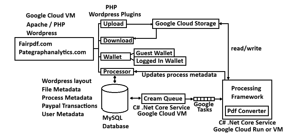WordPress was initially designed for rendering blogs, but now is what is behind many e-commerce platforms such as Shopify. It does not out of the box do things we need it to do such as uploading to user files to cloud storage or list or delete those files, so we needed to write our own plugins to implement those bespoke features in PHP. We also implemented a guest wallet so users can try before they buy. On the plus side now we were using WordPress we are able to leverage popular off-the-shelf plugins to do standard things like user management and payment integration.